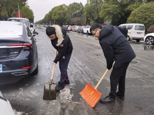 大家不畏天气严寒和道路湿滑,齐心协力、分工协作,扫把、铁锹、推雪板齐上阵,经过1个多小时热火朝天的劳动,由丰盛楼至二食堂主干道前的积雪和冰层已全部清理完毕。大家扫去的是冰雪,带来的是安全出行和集体行动中展示的团结一心、乐观向上、顽强拼搏的战斗精神。