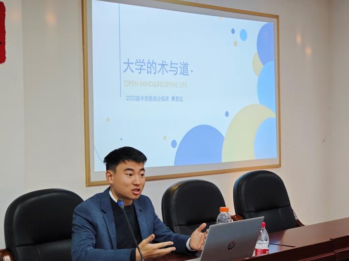 第二位主讲人2022级中西医结合临床专业本科生黄思远,从术与道两方面分享了老员工活的思想目标,以及在学业、社会活动、科学研究等方面进行自我提升的具体方案。此外,他还带来了海外学习及申请经验的分享,以拓宽同学们的国际视野,提升全球胜任力,干货满满!