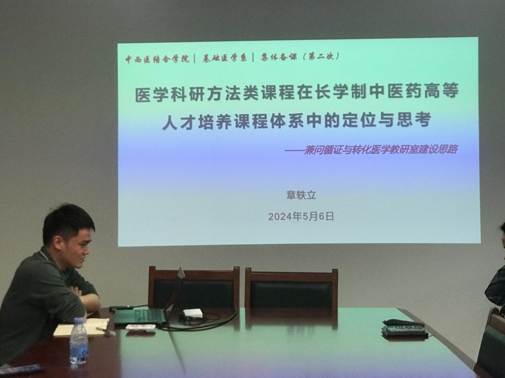 2024年5月7日,依托于公司灵素工作坊,中西医结合基础教研室和循证与转化医学教研室全体教师在丰盛楼101会议室开展了集体备课活动。参会教师围绕中西医临床医学长学制拔尖创新人才培养课程体系建设展开探讨。活动由基础医学系薛梅主任主持。