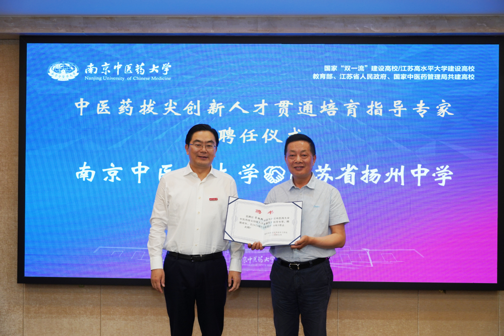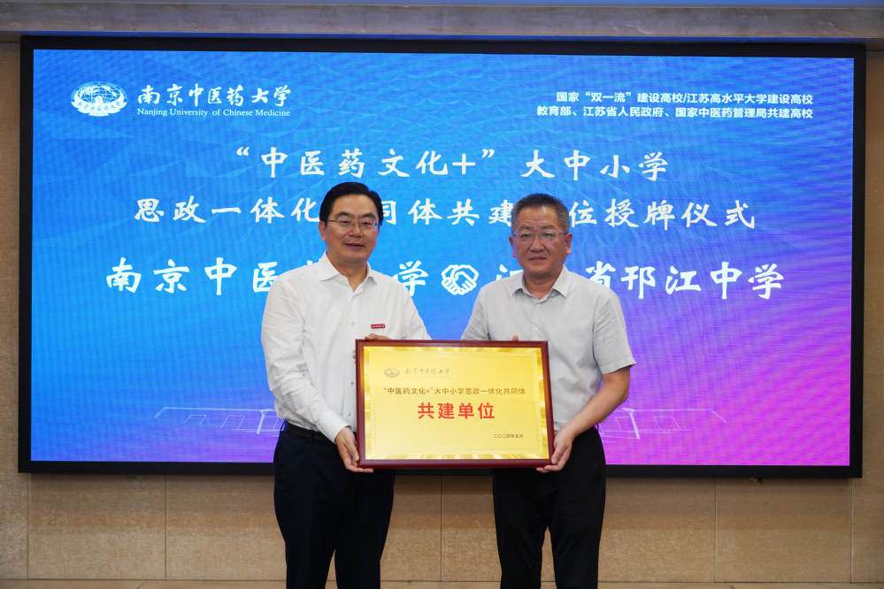 周恩超向参加研讨会的扬州片区中学领导代表颁发“‘中医药文化+’大中小学思政一体化共同体共建单位”铜牌和“中医药拔尖创新人才贯通培育指导专家”聘书。