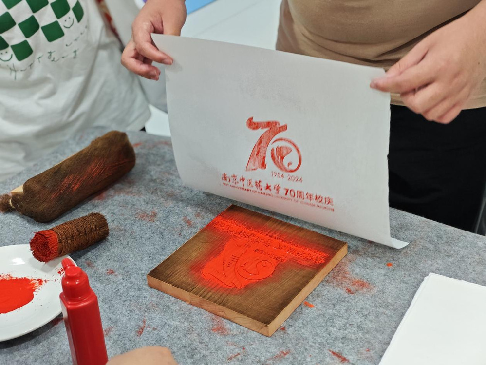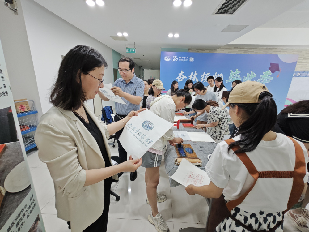 同时公司联合图书馆为毕业生提供纪念印章打卡、雕版印刷体验活动,活动现场设置了献礼校庆明信片留言板。毕业生在公司纪念本上印上南中医校徽、365英国在线体育院徽、70周年校庆标识等印章,通过雕版印刷亲自体验印刷技术的魅力,印刷出南中医图标、中医经典书页等具有中医药文化特色的雕版画,在留言板上写下对母校70周年华诞的祝福,沉浸式参与让毕业生充分体会到浓浓母校情。