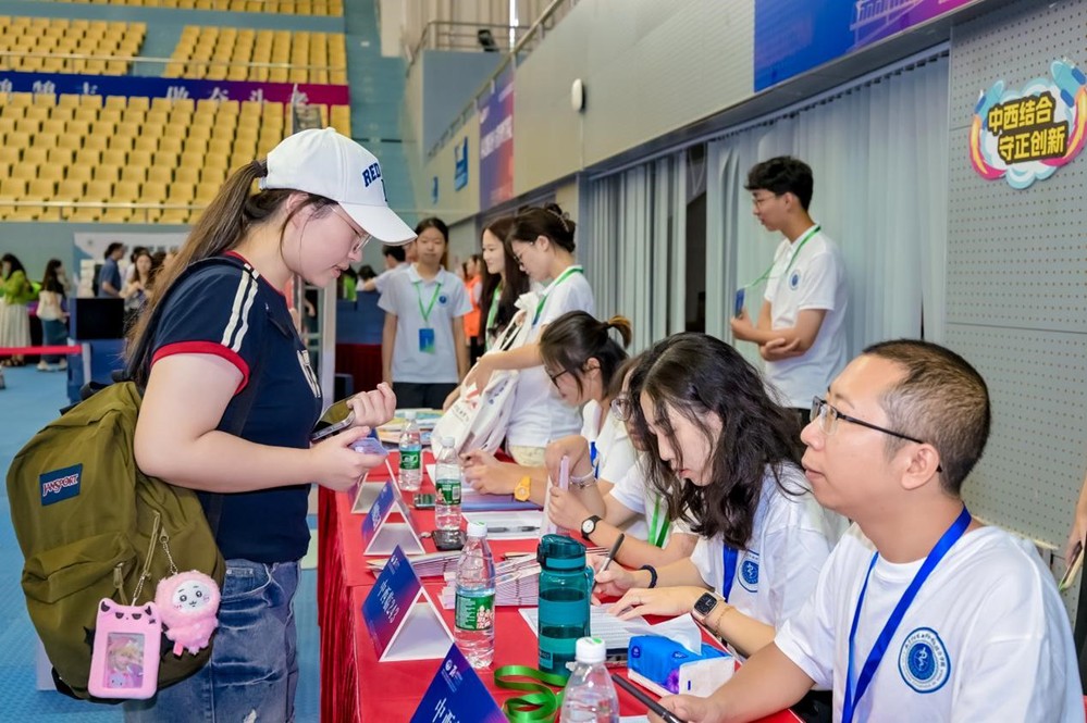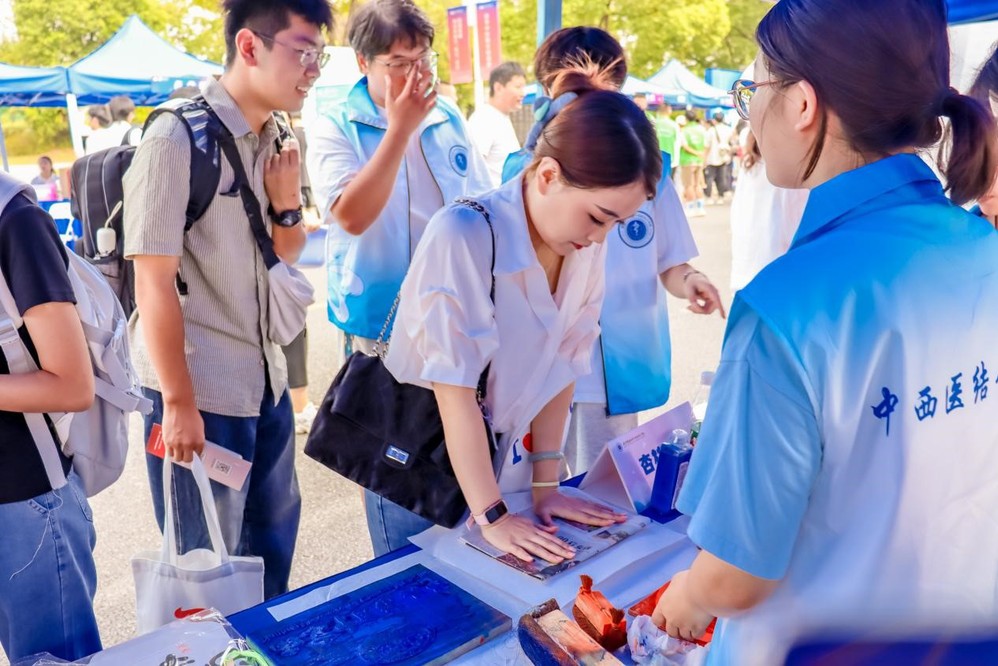 在中医药文化体验街,公司在迎新展示区中通过“专业启航”、“科研启蒙”、“雅艺启心”、“杏林启承”四大板块迎接新生,展现特色风采。由院领导及专家教授组成的“云翔书院教授领航团”在现场接受新生和家长的咨询,解答中西医临床医学专业培养与发展相关的问题,引领专业启航第一步。公司挑战杯国赛特等奖团队进行现场路演,启蒙新生的科研之路。通过漆扇与药茶体验让新生感受传统雅艺和中医药文化。校庆主题拓染让新生参与并感受热烈的70周年校庆氛围,激发学习的动力与信心。
