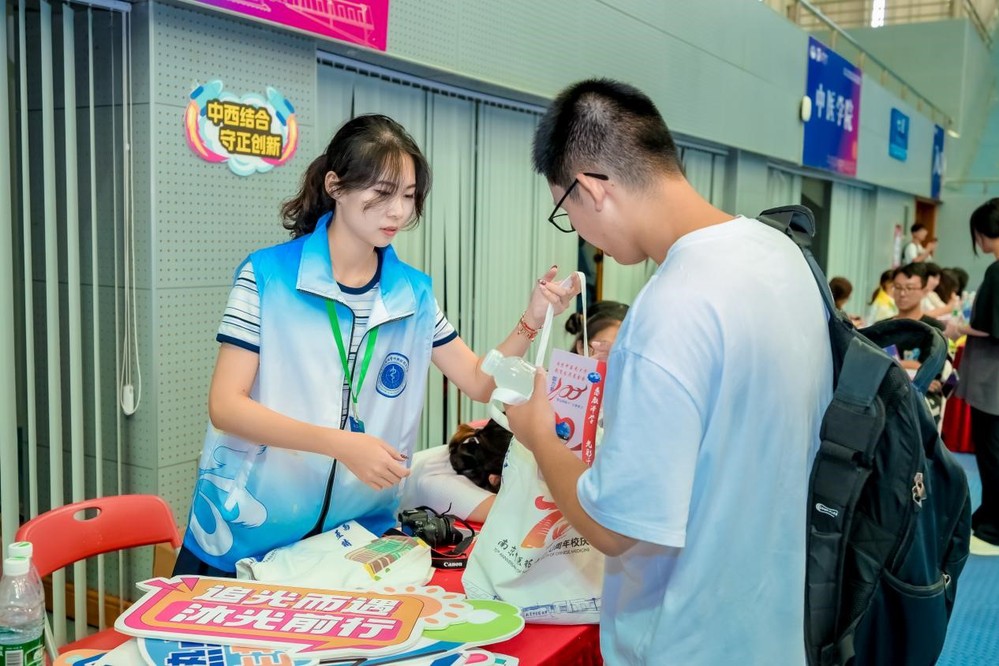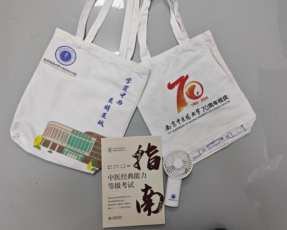 在报到现场,公司为本科生准备了实用又富有意义的入学礼物:印有公司logo和70周年校庆主题的定制帆布袋、一本《中医经典能力等级考试指南》、一台便携小风扇,为研究生准备了实用的科研文具,助力新生迈好“中西结合,医济天下”的第一步。