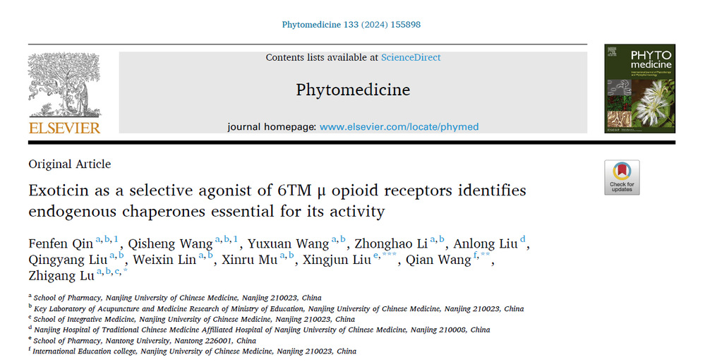近期,365英国在线体育吕志刚教授团队在国际著名杂志Phytomedicine中科院医学一区Top期刊)上发表有关天然产物中特异性靶向μ阿片受体6次跨膜剪切异构体(6TM-MOR)的成果:“Exoticin as a selective agonist of 6TM μ opioid receptors identifies endogenous chaperones essential for its activity”