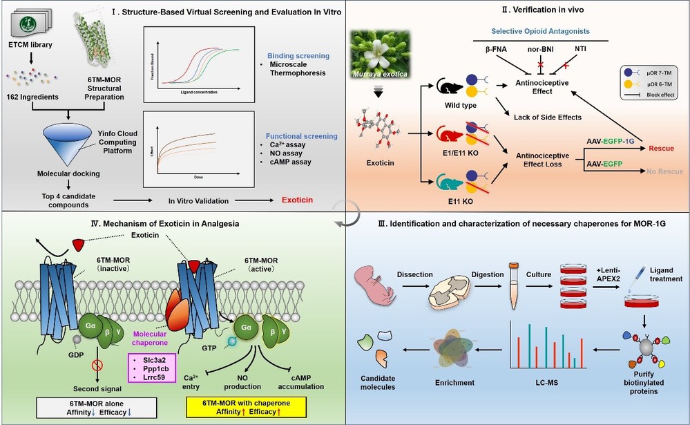 慢性疼痛作为全球性健康问题,对患者生活质量产生严重影响。长期以来,阿片类药物一直是治疗中至重度疼痛的主力军,但其副作用如呼吸抑制、恶心、呕吐、便秘以及成瘾性等问题,严重限制了其临床应用。近年来,吕志刚教授曾在纪念斯隆凯特癌症中心工作的研究团队对μ-阿片受体基因Oprm1剪切异构体展开深入研究,发现Oprm1受体N端剪切产生的6次跨膜剪切异构体6TM-MOR与传统的7次跨膜7TM-MOR发挥截然不同的药理作用,6TM-MOR为无传统阿片类药物副作用的中枢镇痛药物靶标(Lu Z, Xu J, et al. Mediation of opioid analgesia by a truncated 6-transmembrane GPCR. J Clin Invest. 2015 Jul 1;125(7):2626-30.Lu Z, Xu J, et al. Truncated μ-Opioid Receptors With 6 Transmembrane Domains Are Essential for Opioid Analgesia. Anesth Analg. 2018 Mar;126(3):1050-1057.)。本研究首次从天然产物中筛选出特异性靶向6TM-MOR的药物及其发挥作用的分子伴侣,这对丰富6TM-MOR的药理研究和靶向6TM-MOR的新型镇痛药物开发具有重要意义。