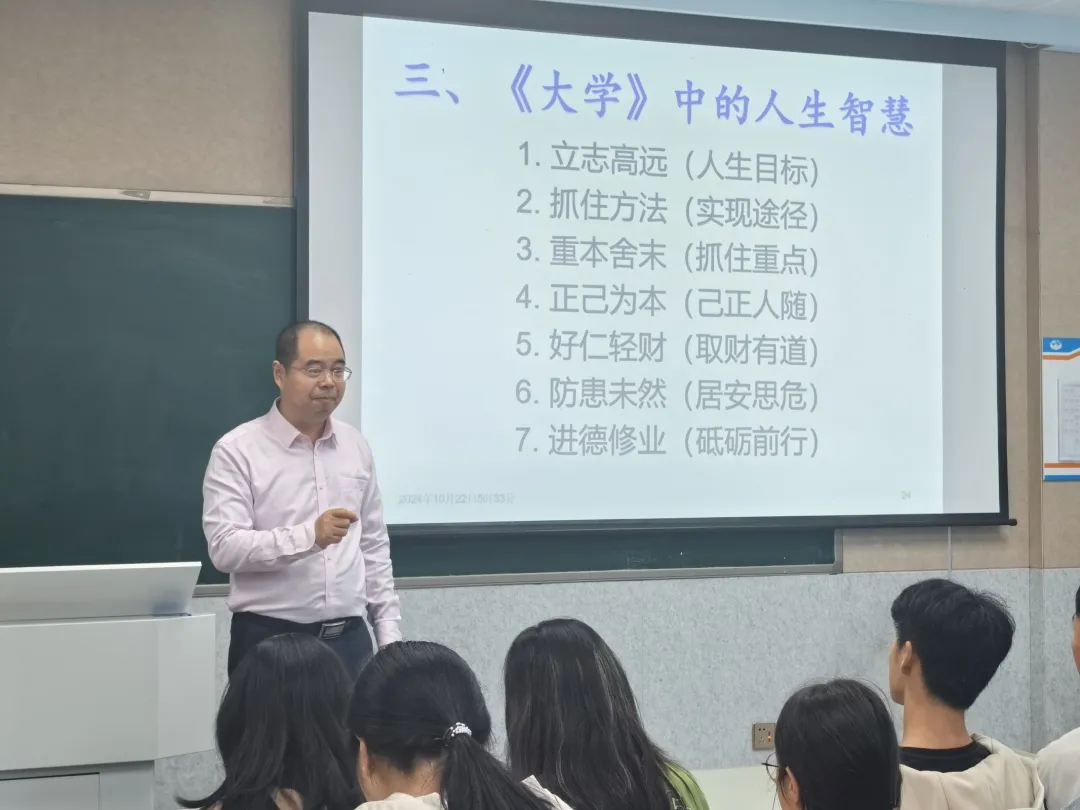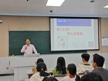 本次讲座共分为三个部分,分别是为什么要读经典、共同诵读《大学》和《大学》中的人生智慧。王老师首先指出,诵读经典有助于当代青年汲取古代哲人的智慧,形成正确的世界观、人生观和价值观,同时也能给心灵一片能够静下心来思考的净土。尤其对于中医相关专业的同学们来说,多读中医经典著作还能培养中医思维,这对同学们未来的从业是十分有帮助的。随后,与会员工朗读了《大学》的部分篇章,对《大学》的内容有了大致的了解和熟悉,热情饱满、抑扬顿挫的读书声响彻教室。结束朗读后,王老师以提升幸福力的方法、医患沟通的艺术等为例详细讲述《大学》中的人生智慧与“修身、齐家、治国、平天下”的深远意境。