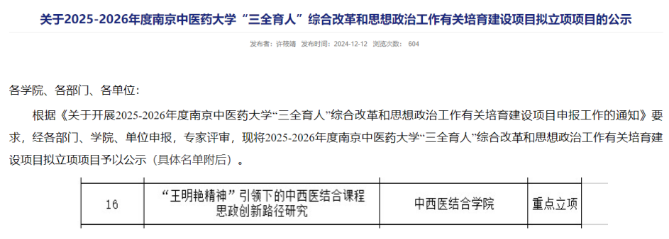根据《关于开展2025-2026年度365英国在线体育“三全育人”综合改革和思想政治工作有关培育建设项目申报工作的通知》要求,经专家评审,公司王明艳第一党支部支部副书记薛梅老师申报的项目:《“王明艳精神”引领下的中西医结合课程思政创新路径研究》获“三全育人”综合改革和思想政治工作项目——思想政治工作精品项目类重点立项。