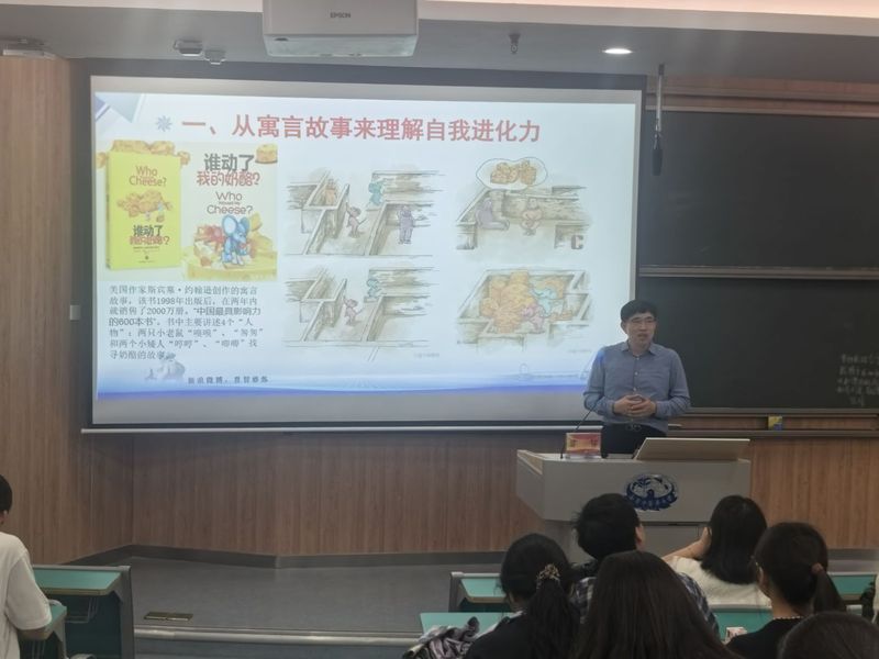 讲座伊始,曾智教授首先通过作家斯宾塞·约翰逊的寓言故事——《谁动了我的奶酪》引入话题,结合书中的内容和当下的社会发展,以一个寓言故事,告诉大家最完美的生活也可能遭遇不测,在社会中适应变化绝非易事,要对当下自己处境进行思考,以改变自己,提高自己。