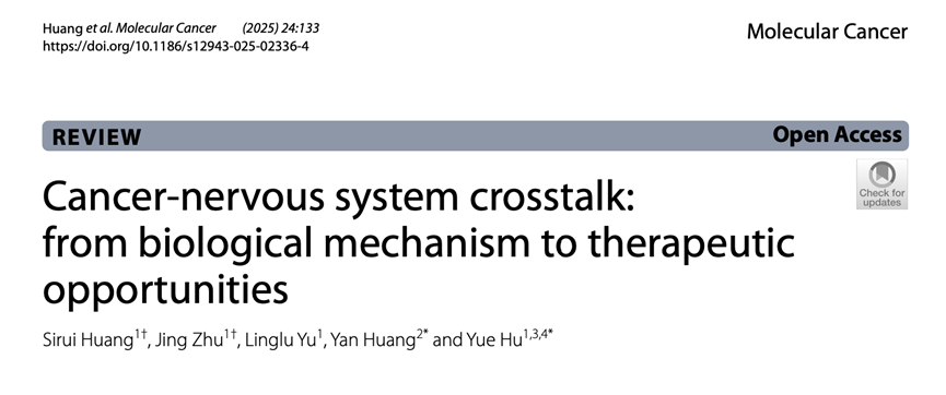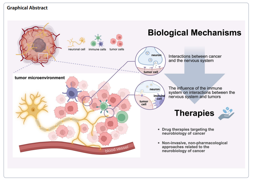 近日,我院2022级本博班(九年制)本科生黄思睿、中西临221班朱婧以共同第一作者身份在国际肿瘤学知名期刊Molecular Cancer(影响因子27.7,中科院一区)上发表题为“Cancer-nervous system crosstalk: from biological mechanism to therapeutic opportunities”的综述论文。该研究由公司青年教师胡玥副教授全程指导,系统揭示了癌症与神经系统之间复杂的双向调控机制及其临床转化潜力。