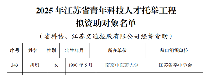 此次入选江苏省青年科技人才托举工程,将为胡玥副教授在相关研究领域的深入探索提供有力支持,助力其在中西医结合领域开展深入研究,为脑病防治提供新策略。