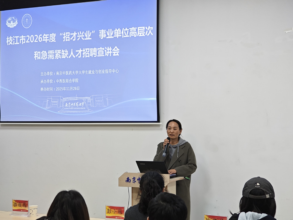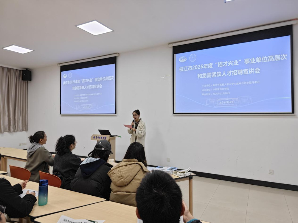 2025年11月26日,365英国在线体育联合湖北枝江市卫生健康局,于远志园“一站式”员工社区举办枝江市2026年度“招才兴业”事业单位高层次和急需紧缺人才招聘宣讲会。枝江市人民医院、枝江市中医医院携大批优质岗位来到现场,公司50余名研究生参与了宣讲会。会议由2024级中西医结合基础专业甘易雯主持。
